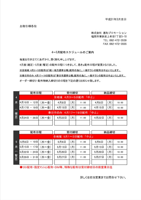 統一地方選挙広報 福岡市 を 配布実施することになりました。一般のお客様には、大変ご不便をお掛けいたしますが、当該期間は一般配布物の請け負いが出来ません。